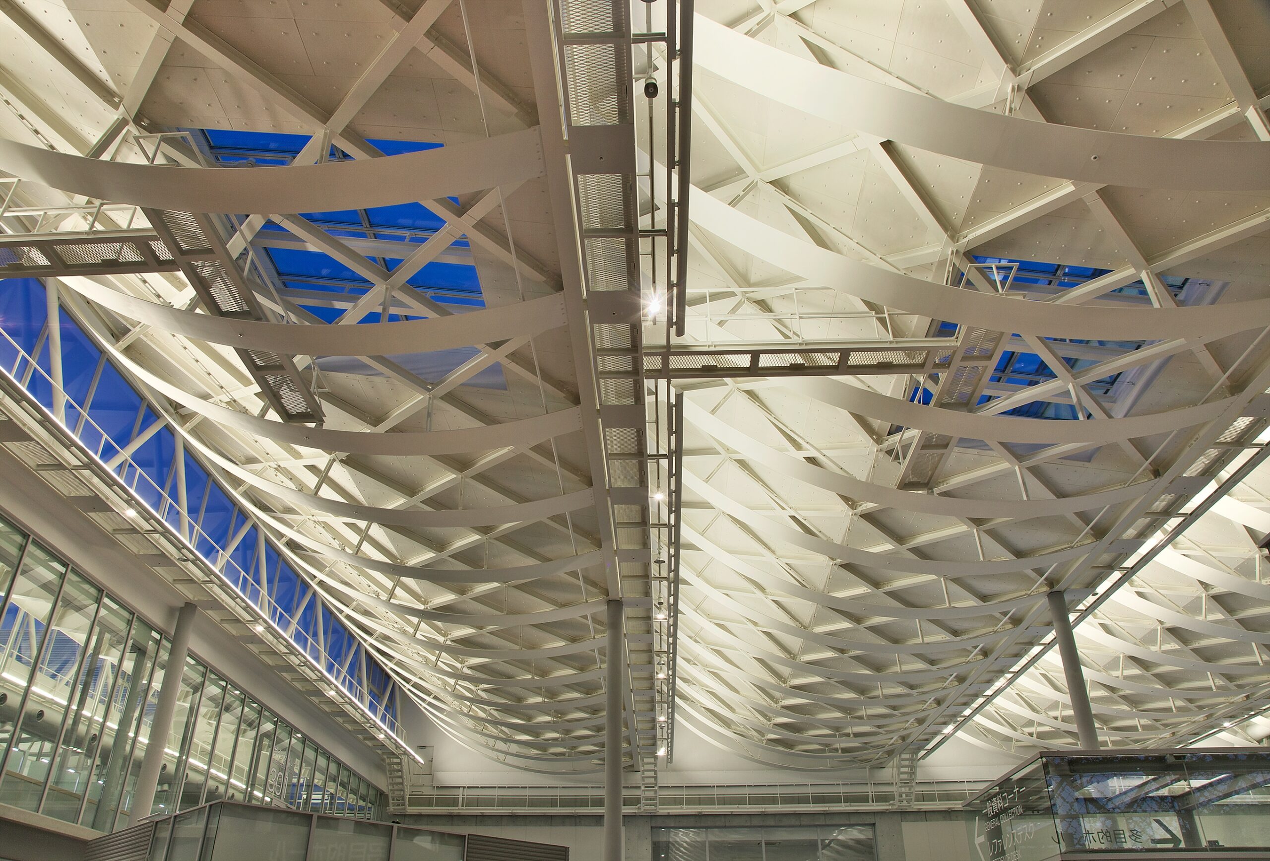 特に帯状の下弦材には、細いロッド材やH形鋼などとはせず、一見してプレートに見えるFBの組合せ材を用いた。「構造としての既視感を消す」ことで、格子の視覚的イメージをより強調することを考えた。さらに、この構造材らしからぬ柔らかさを持った帯状部材は、束材やトラス大梁とのボルト接合、ガセットプレートの目隠しにもなるため、接合部の簡素化とコストダウンも可能としている。また、ハイサイドからの光の反射と拡散、スプリンクラー配管等の目隠し、空調ダクトの視覚的な制御に寄与しており、構造材としてだけではなく意匠材、設備材となり、環境調整装置として有効に機能させている。