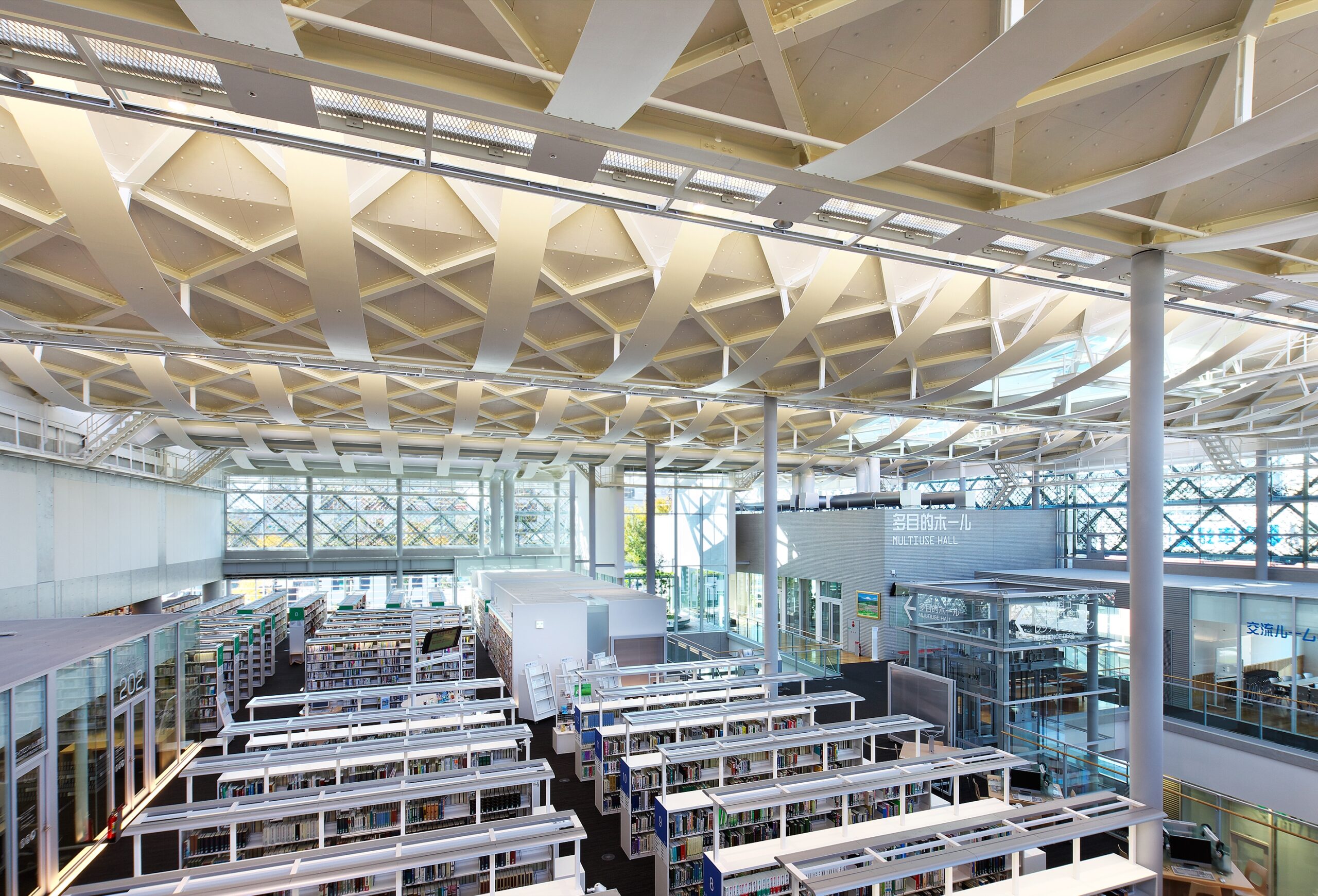 建築は、9mグリッドを基本とした 49×72mの長方形平面である。メイン空間となる2階の閲覧スペースは、トラス大屋根で覆われた2層分の階高の自由で開放的な空間となっているが、この架 構を成り立たせるために、東側1スパンを鉄骨鉄筋コンクリート造による耐震コア架構とし、トラス大屋根と連結させている。